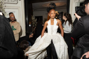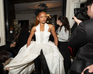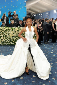 Keke Palmer returned to the Met Gala, turning heads with a dramatic entrance following her appearance at last year’s event. The actress wore a deconstructed tuxedo gown in adherence to the night’s “Superfine: Tailoring Black Style” theme. Here she is, leaving her hotel to go to the red carpet. She happily showed off the voluminous dress: