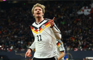 Germany’s Nick Woltemade celebrates scoring his side’s first goal against Slovakia in their World Cup UEFA Qualifiers, Group A match at Red Bull Arena, Leipzig, Germany on November 17, 2025 [Lisi Niesner/Reuters]