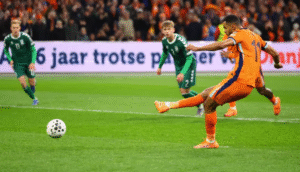 Netherlands’ Cody Gakpo scores his side’s second goal from the penalty spot against Lithuania in their World Cup UEFA Qualifier, Group G match at Johan Cruijff Arena, Amsterdam, the Netherlands, on November 17, 2025 [Piroschka Van De Wouw/Reuters]